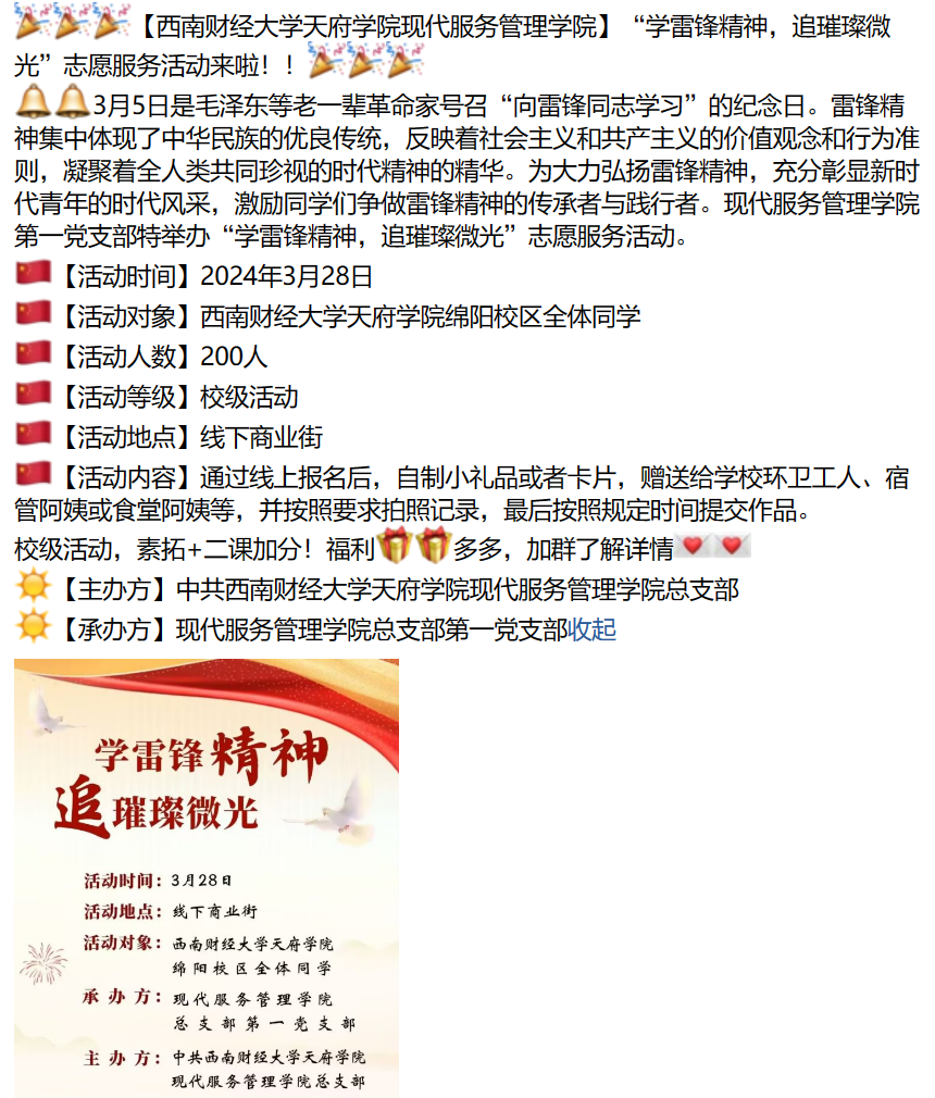 雷锋精神代代传,无私奉献谱新篇。为大力弘扬雷锋精神,充分彰显新时代青年的时代风采,激励同学们争做雷锋精神的传承者与践行者。现代服务管理学院第一党支部于3月28日-30日特举办“学雷锋精神,追璀璨微光”志愿服务活动。