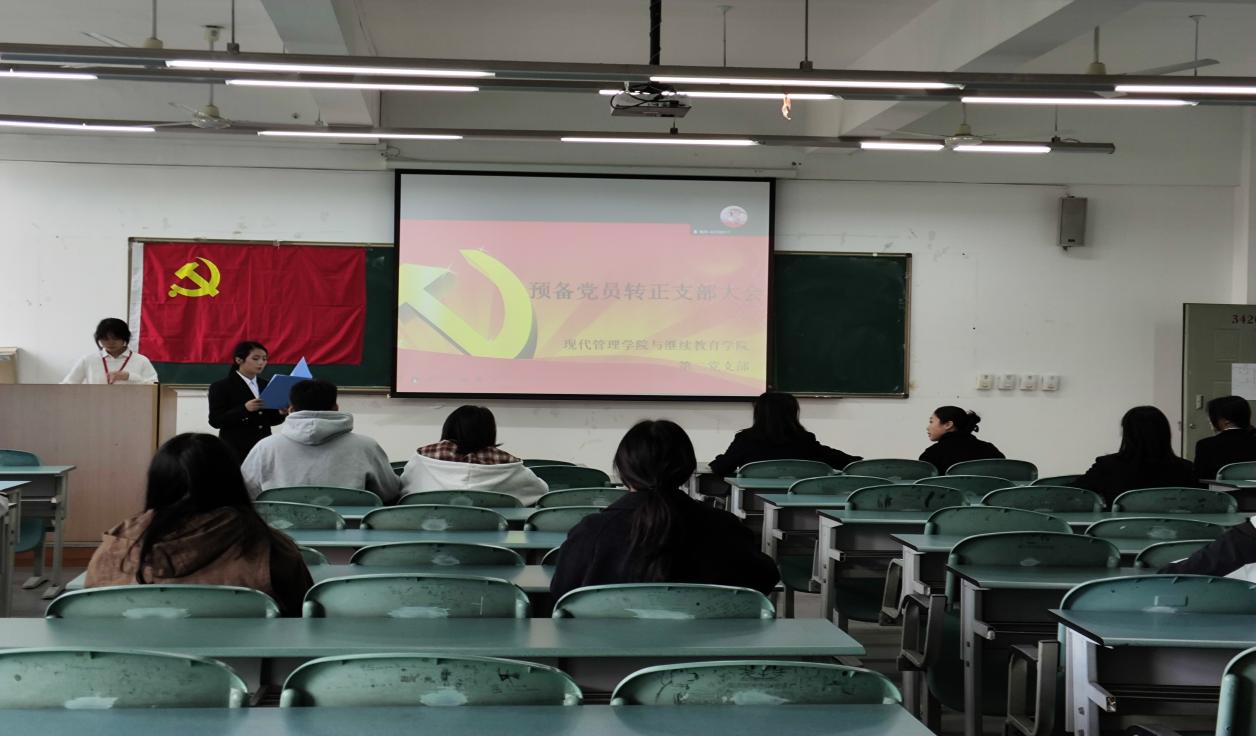 为扎实推进党员队伍建设,严把党员“入口关”,确保党组织的纯洁性和战斗力。现代管理学院与继续教育学院第二党支部于11月20日在3420教室召开积极分子发展预备党员暨预备党员转正式党员支部大会。此次会议由谯丽华同志主持,第二党支部书记赵萌、组织委员徐梓焓等16名正式党员、17名预备党员、8名发展对象共同参与。