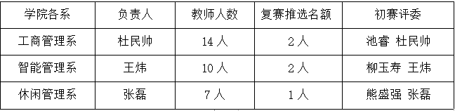 本次大赛采取各系初赛、院级复赛二级遴选,选拔复赛成绩排名前2名教师参加校级决赛。4月27日前各系组织开展初赛;5月10日学院组织开展复赛。
