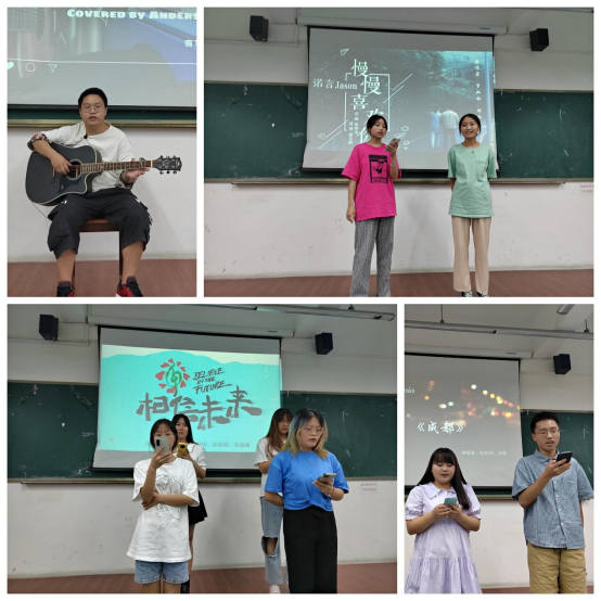 首先,有请嘉宾牟文浩老师为即将实习的学生进行了上台演讲,为还在迷茫中的学生们减轻焦虑感。接着是丰富多彩的表演环节,由2020级的陈欣悦、曾瑜璐、肖书瑶、陈丽蓉四位同学进行诗朗诵《相信未来》,同学们的朗诵充满了情感,抑扬顿挫,让下面的观众们充满了干劲。之后是来自2019级的同学们带来的精彩节目:赵秋玥和邱骏演唱的歌曲《成都》、罗双钰和邓欣欣演唱的歌曲《慢慢喜欢你》、陈泓西的吉他弹唱……精彩纷呈的节目让同学们如醉如痴,更是让处于焦虑期的同学们放松了心情,减轻了压力。接着是游戏环节-—看图识景,作为旅游管理专业的同学,对于祖国的大好河山应该是极为熟悉的,能够通过照片最先猜中景区景点的同学,将会获得精美小礼品一份,同学们积极参与,现场反响热烈。活动的最后环节是“写给六个月之后的自己”,主持人让志愿者分发便利贴,请同学们写下自己要对六个月实习之后的自己的话。