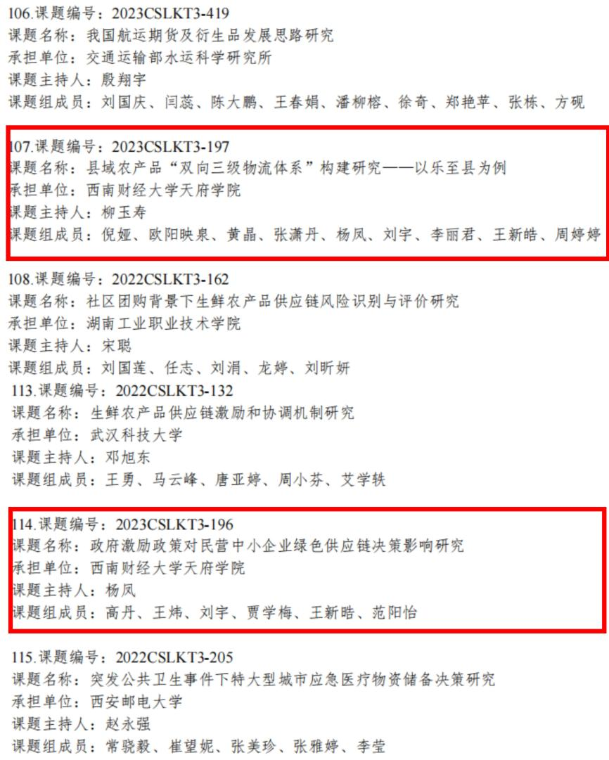 中国物流学会、中国物流与采购联合会研究课题以拓展行业研究平台、提升物流、采购与供应链研究水平为主旨,按照创新、协调、绿色、开放、共享的发展理念,根据供给侧结构性改革、物流业高质量发展需要持续开展项目研究。现代服务管理学院教师积极参与课题申报,围绕行业发展的重点、难点、热点问题进行研究,为政府决策、行业发展、企业创新提供参考和服务。