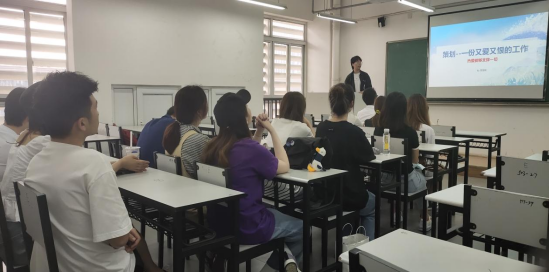 贾晋貌同学以“是因工作放弃热爱,还是因热爱选择工作?”一问引入了分享话题,他谈到“热爱与工作并不冲突,哪怕是热爱的工作也有苦难,而在工作中也能找到热爱,我们的热爱能够支撑一切”。他向同学们分享了自己从事策划行业以来面临的各种困难和获得的成就,他幽默地向同学们说“哪怕是我的脑子告诉我它一滴也没有了,但我也要不断尝试新的方法,不断产出新的创意,我们的工作好像就是这样”。听起来很累,但热爱,是他一直以来坚持的理由,成功的秘诀就是在面对困难时积极应对困难,“不是逃避,而是拥抱”。