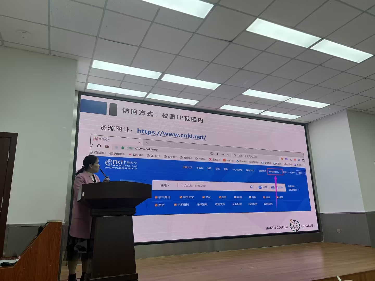 2024年11月12日,同方知网西部市场开发部高级培训讲师尹佳妮老师和西财天府学院图书馆数字资源建设兼任文献保障与知识服务研究中心主任周晓慧副研究员在实验楼110教室为现代服务管理学院的同学开展了一场主题为 “从科研小白到论文达人”的讲座。在讲座开始时讲座伊始,尹佳妮老师向同学们介绍了学位论文的整体写作流程,从选题开题、文献搜集与阅读、论文撰写到修改完善,每-个环节都进行了详细的阐述。她强调,论文写作是一个系统工程,需要同学们具备清晰的思路和扎实的写作能力。